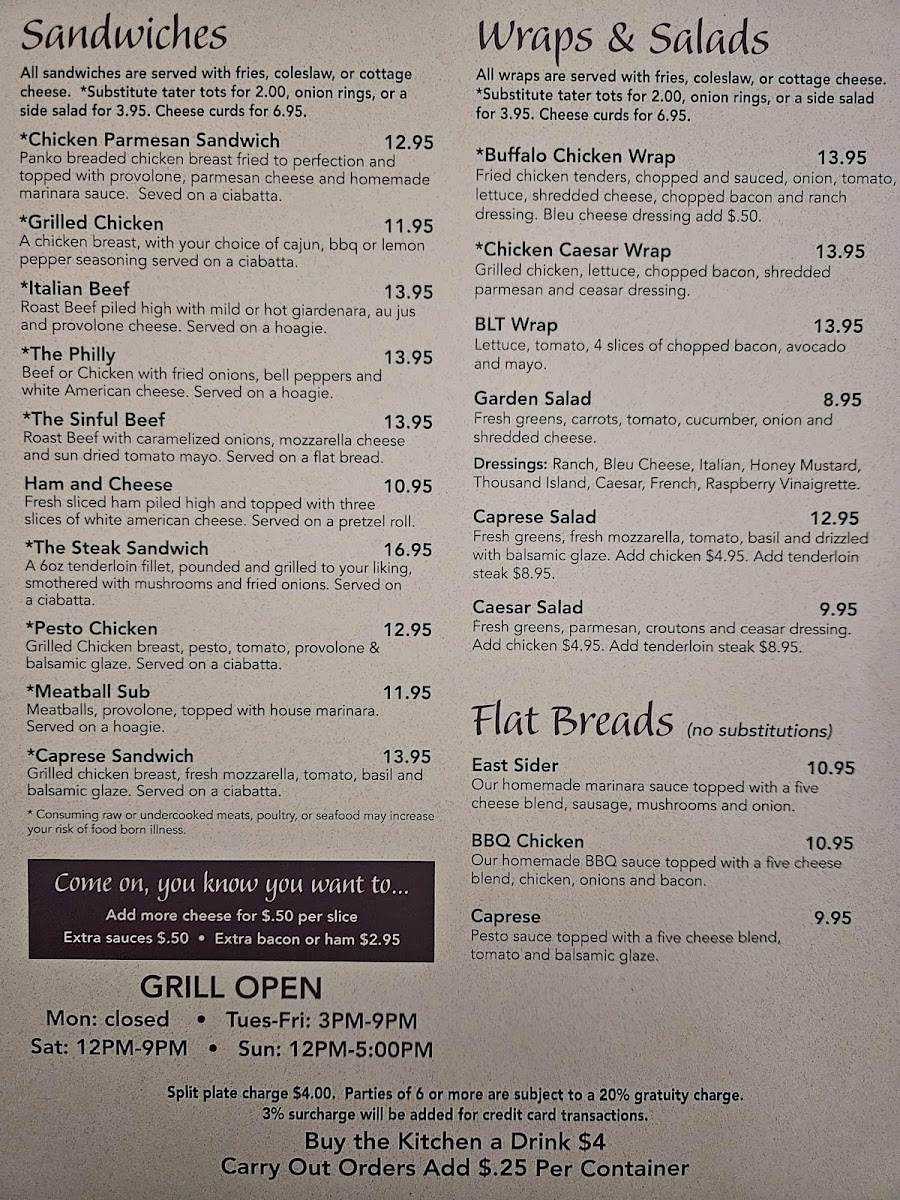 You’ll find a variety of familiar plates and shareable bites, from savory sandwiches like the blackened chicken or Italian beef to crisp appetizers such as chicken wings served with your choice of homemade sauces. Light salads with ingredients like caprese or raspberry provide fresh contrast, while flatbread pizzas and hard shell tacos add a fun, informal touch to the lineup.