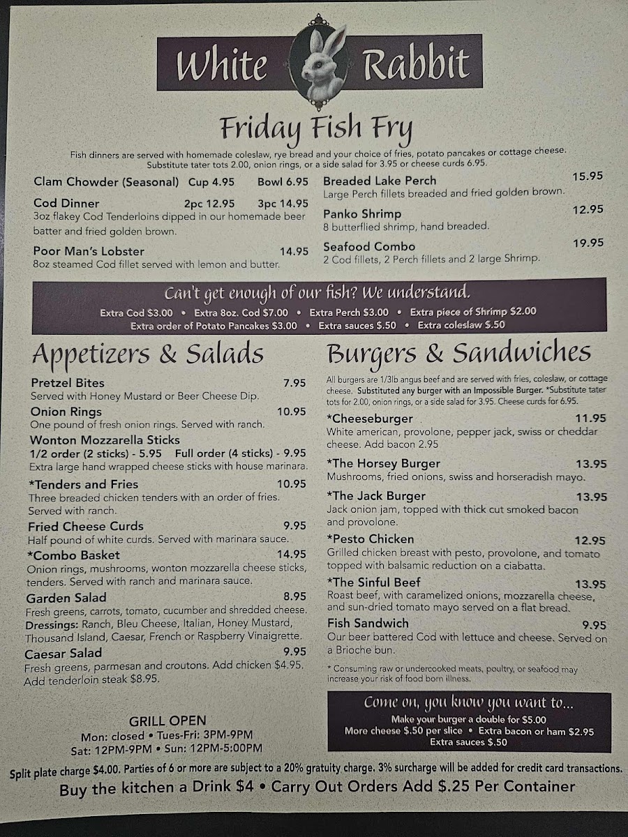 The menu at White Rabbit Bar and Grill offers a relaxed selection of hearty bar and grill favorites meant to satisfy casual dining occasions. Whether you’re stopping in for a midweek meal, enjoying a game day gathering, or finishing off a bike trail ride, the food strikes a balance between comfort and fresh flavors.